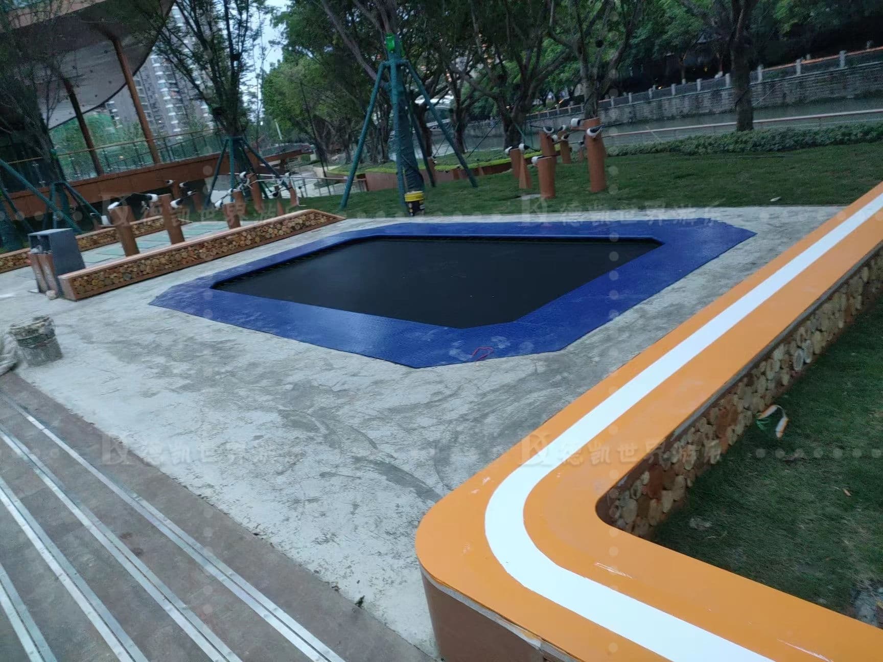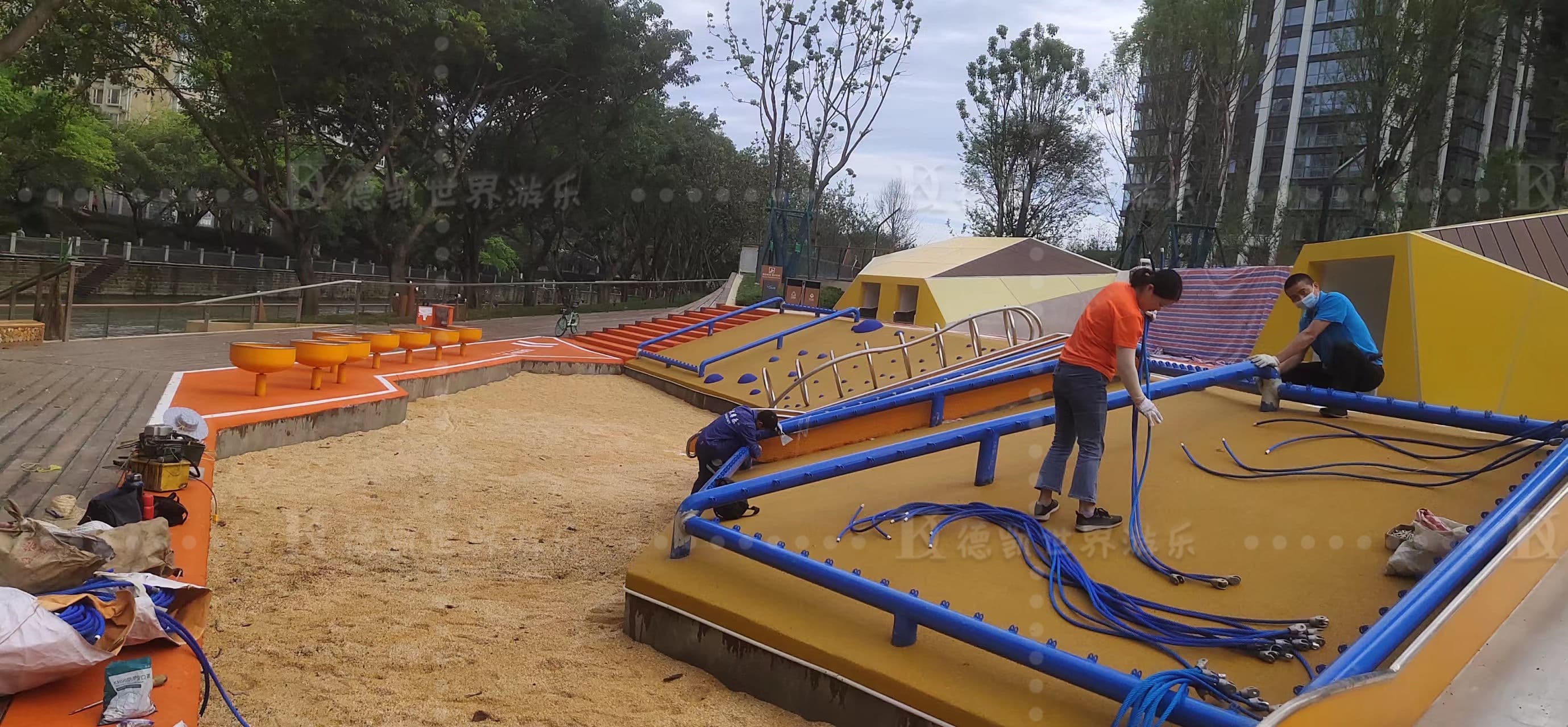成都濱河公園游樂設施安裝完工,本著休閑娛樂,拓展運動為主。游樂設施涉及蹦床、滑梯、沙池、攀爬繩網、其它單品等,滿足不同年齡段人群互動體驗。